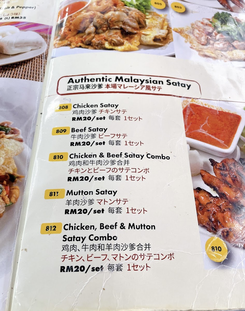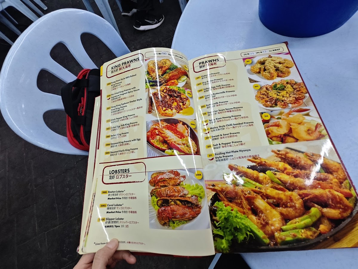 The menu offers a variety of Malaysian and local fusion dishes, featuring a range of seafood, poultry, and beef options. Key categories include grilled specialties such as satay and stingray, stir-fried dishes, rice and noodle plates, as well as a selection of seafood prepared in different styles, including crab and prawn dishes.